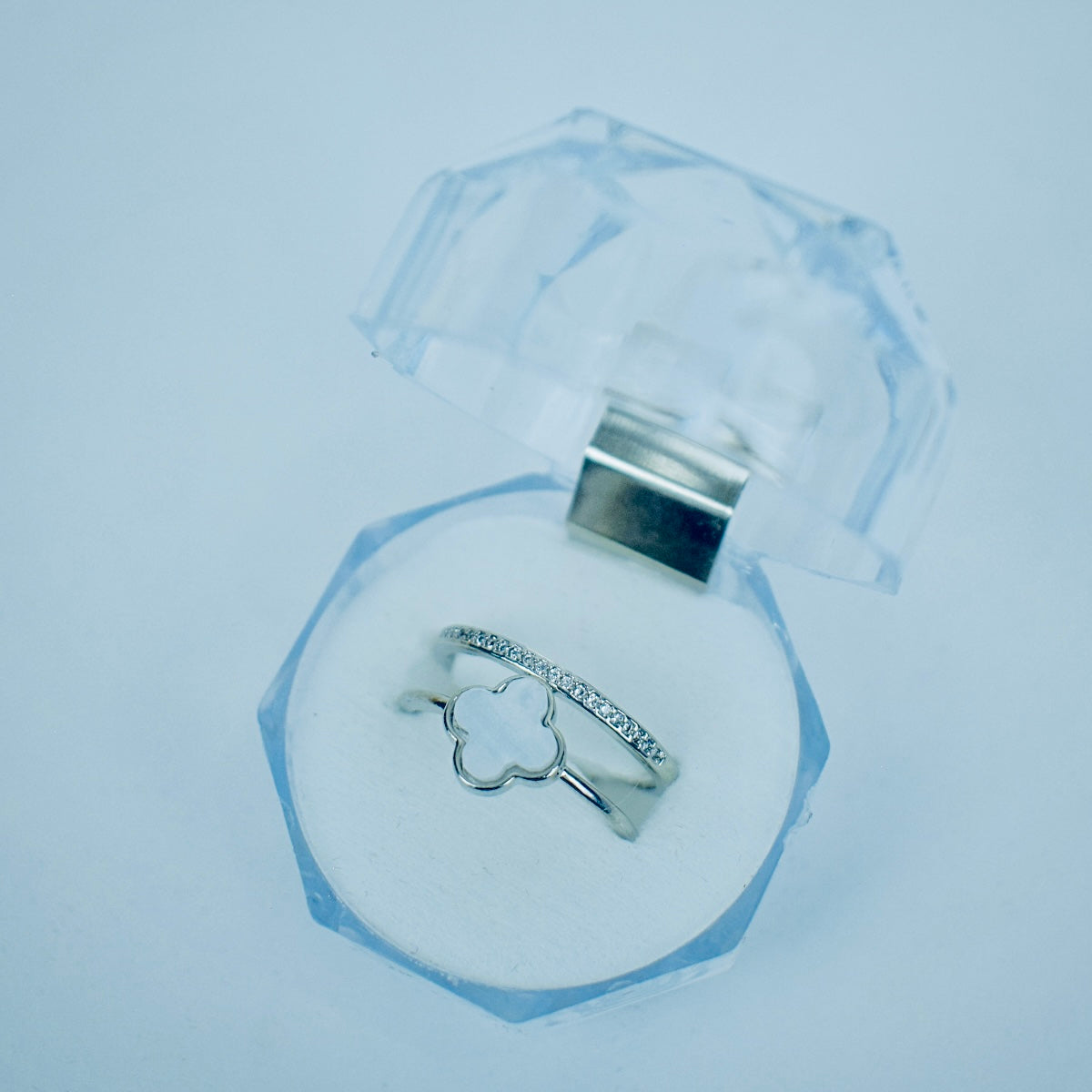 Add a touch of modern elegance with our Clover Adjustable Ring, available in both Golden and Silver tones. Designed with a sleek clover motif and a row of sparkling stones, this ring is a perfect blend of sophistication and style.